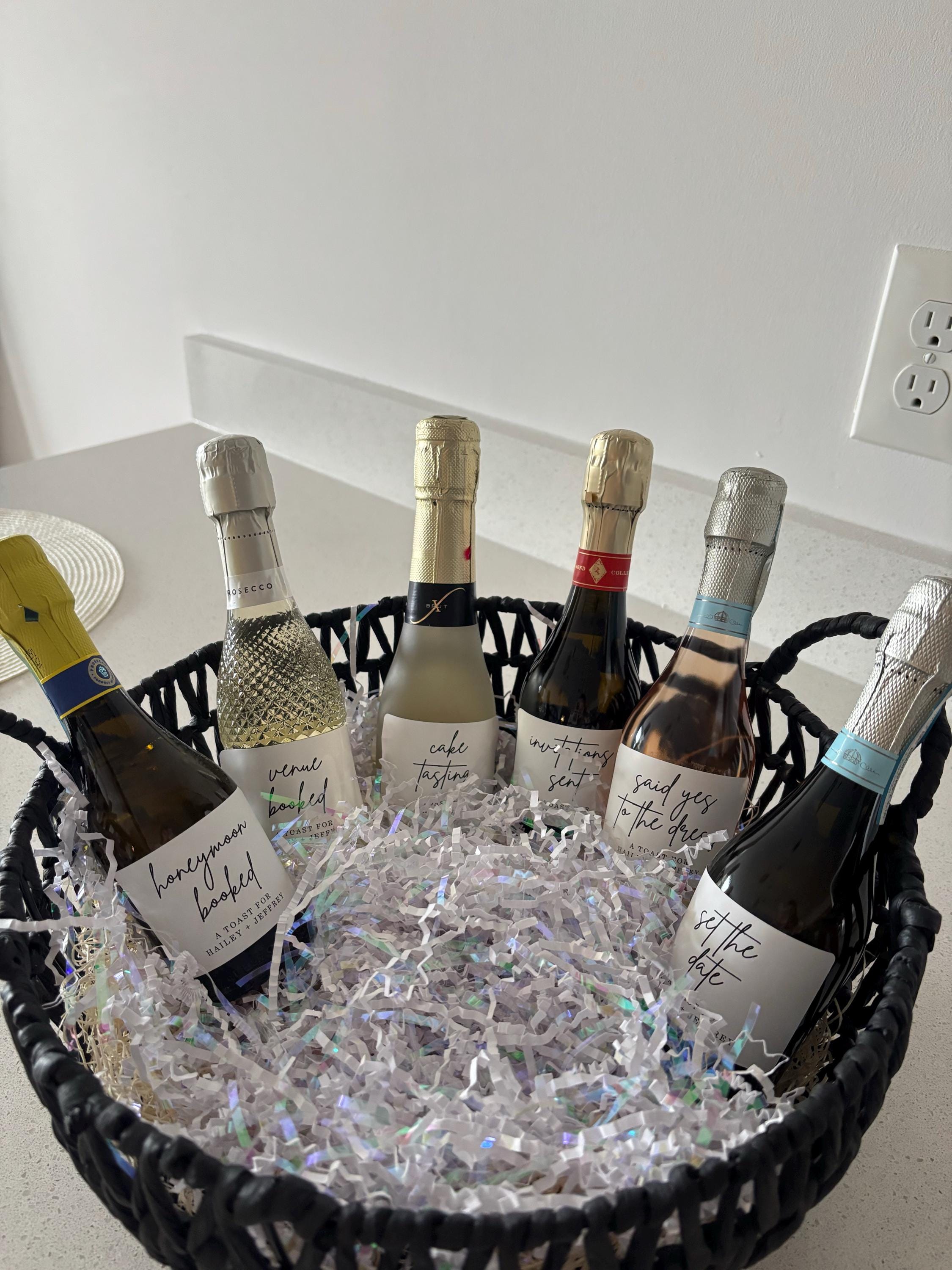 These labels are a thoughtful engagement gift for the bride and/or groom. Imagine them popping a bottle of champagne or uncorking a bottle of wine each time they accomplish another milestone on their way to marriage.