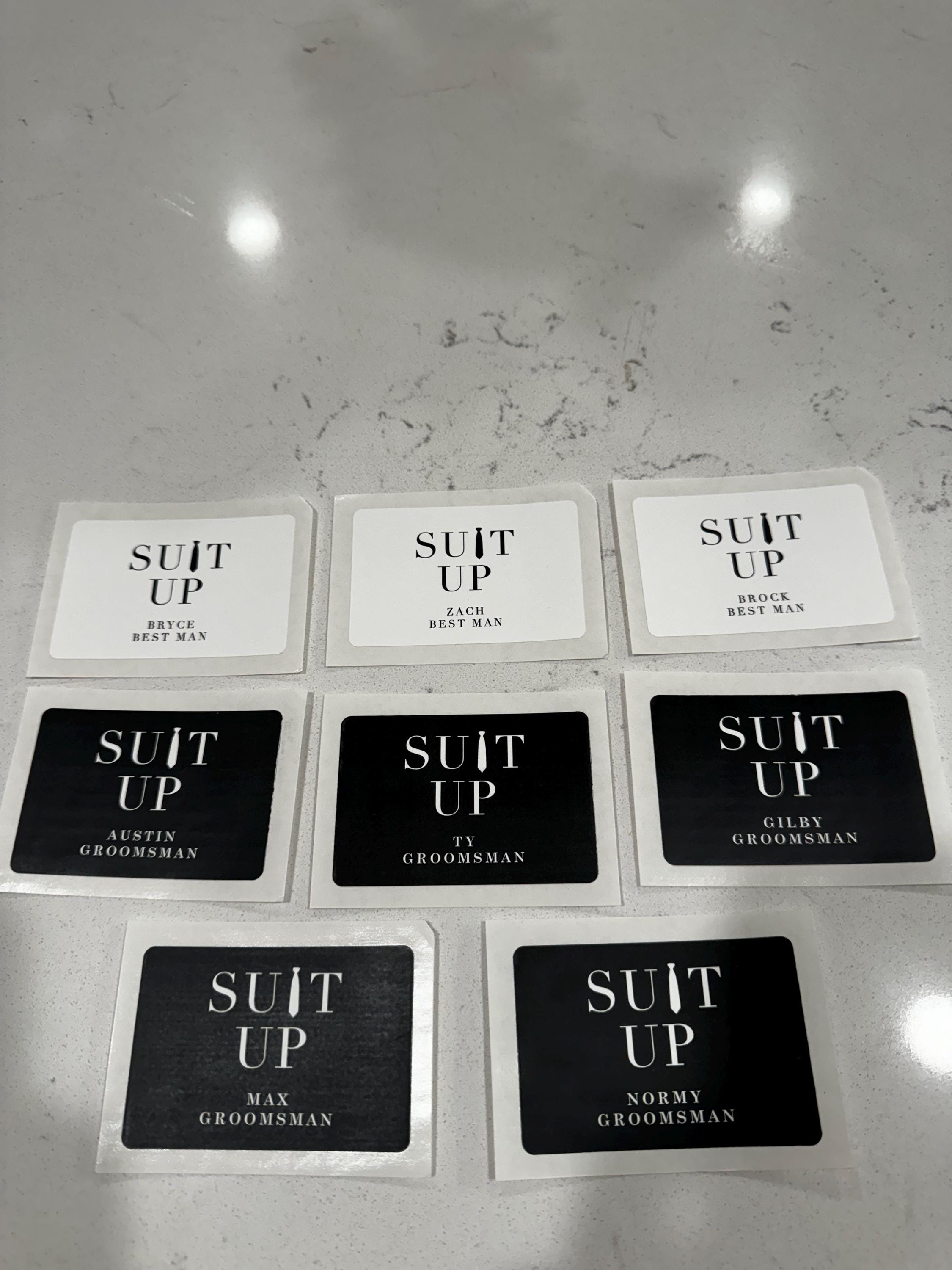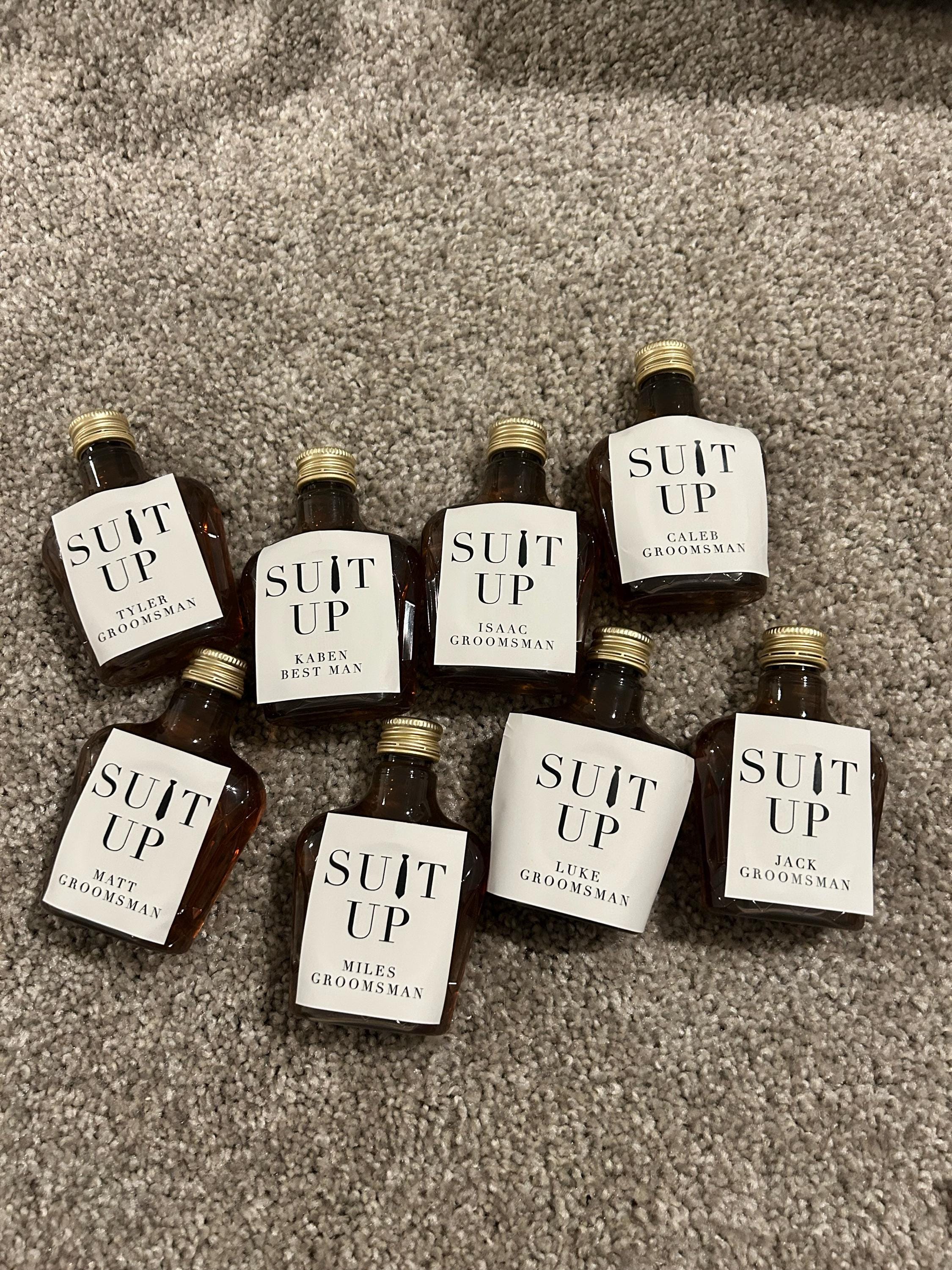 This personalized Suit Up mini liquor bottle label is perfect for your groomsman proposals, best man proposals, and bachelor party favors. The 3” W x 2" H label fits most straight-sided 50ml and 100ml mini liquor bottles, including mini tequila, whiskey, rum, and vodka shooters.