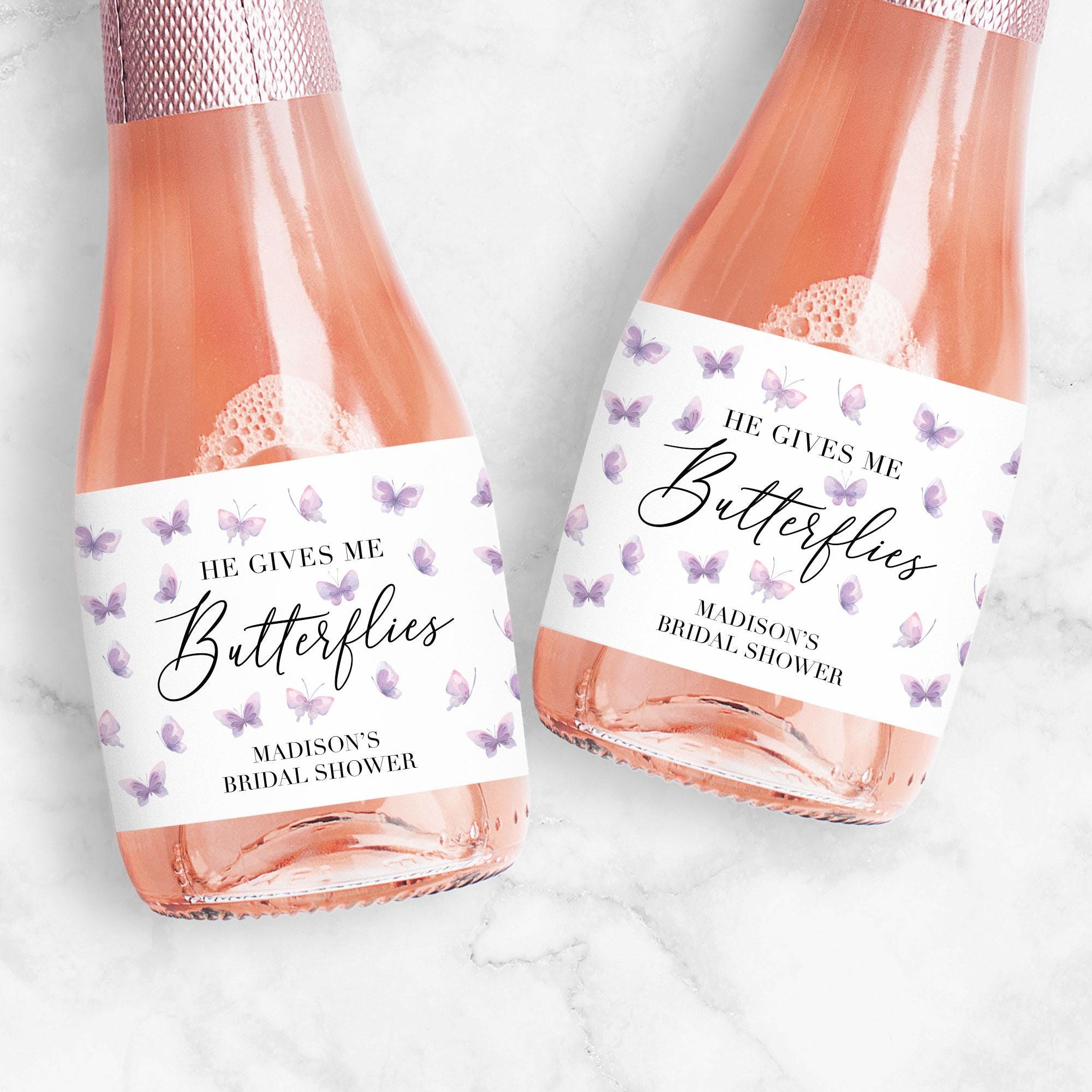 This personalized He Gives Me Butterflies champagne or wine bottle label is perfect for your bridesmaid proposals, bridal shower favors, and bachelorette party favors. You're bridal party will love these!